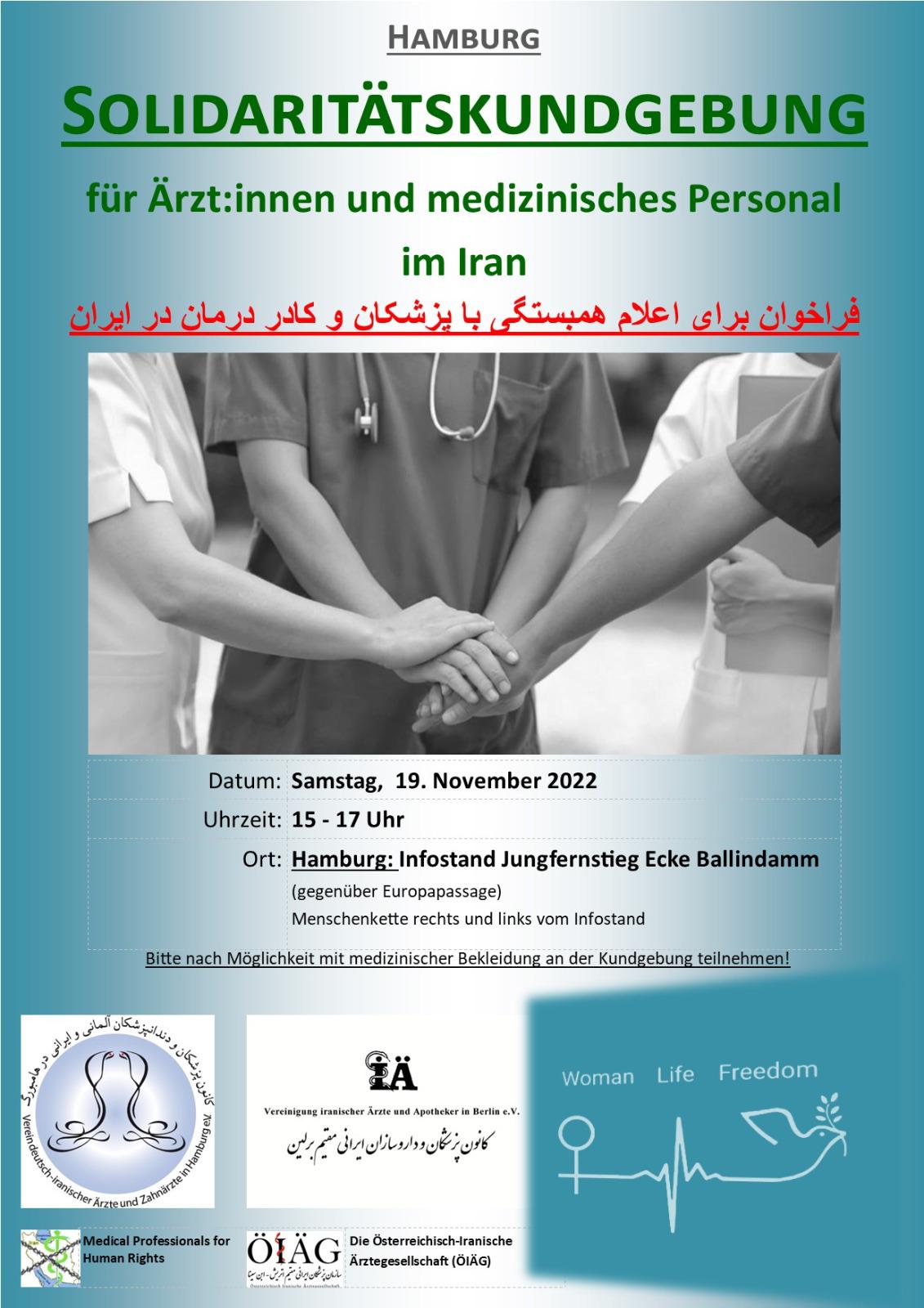 Programmänderung Tagung am 19.11.22 findet statt: 10-11.30 h Vorträge Pause mit Besuch der Sponsoren-Ständer 12:15 Uhr offenes Podium: Situation im Iran, wie können wir helfen? 13:45 Uhr Mitgliederversammlung mit Satzungsänderung (Ergänzung humanitären Maßnahmen, Aufnahme der Psychotherapeuten). 15-17 Uhr Ärzte/medizinisches Personal, Kundgebung und Menschenkette mit weißem Kittel an der Binnenalster (Jungfernstieg Ecke Ballindamm).